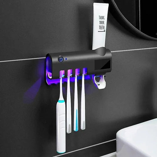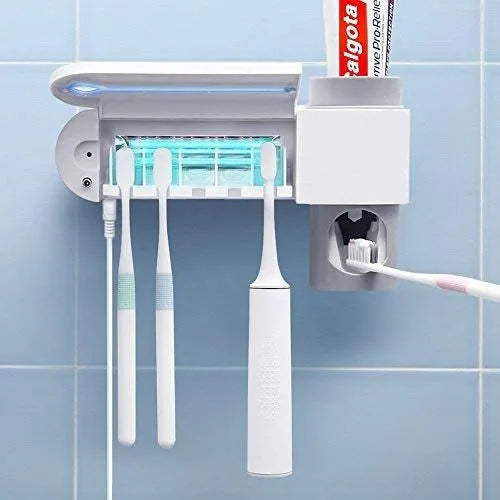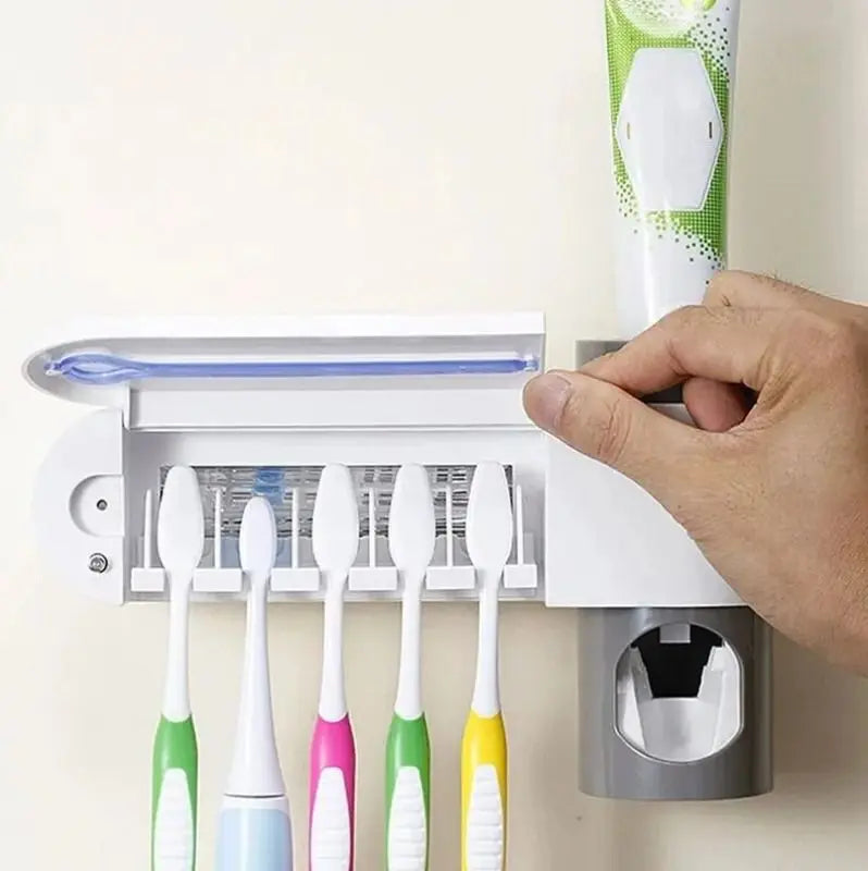 Mantenha sua escova sempre limpa, seca e protegida contra germes e bactérias através do suporte esterilizador de escova de dentes com luz UV e dispensador automático de pasta de dente.